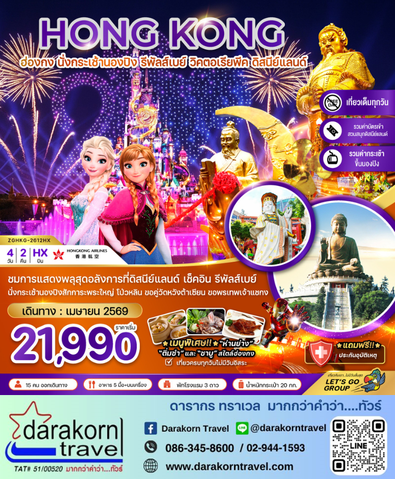 | DAY3 | ฮ่องกงดิสนีย์แลนด์เต็มวัน ชมการแสดงดอกไม้ไฟ(บริการรถรับ – ส่ง เคาท์ดาวน์ภายในสวนสนุก) |