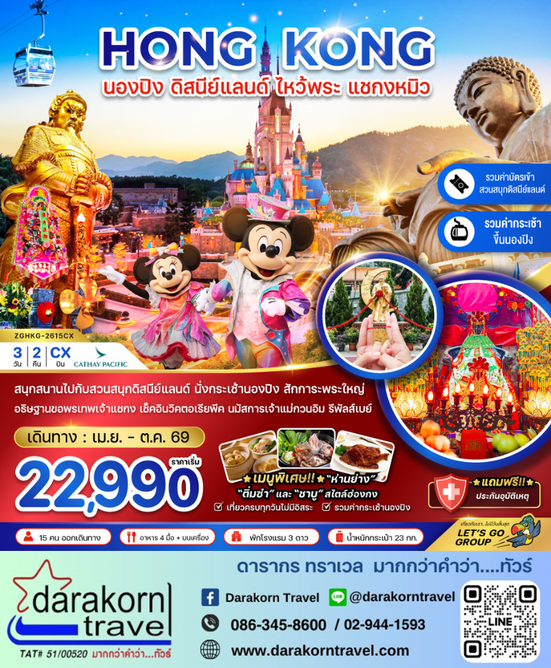 ทัวร์ฮ่องกง - ฮ่องกง นองปิง ดิสนีย์แลนด์ ไหว้พระ แชกงหมิว 3วัน2คืน(CX)เดือนเมษายน - ตุลาคม 2569