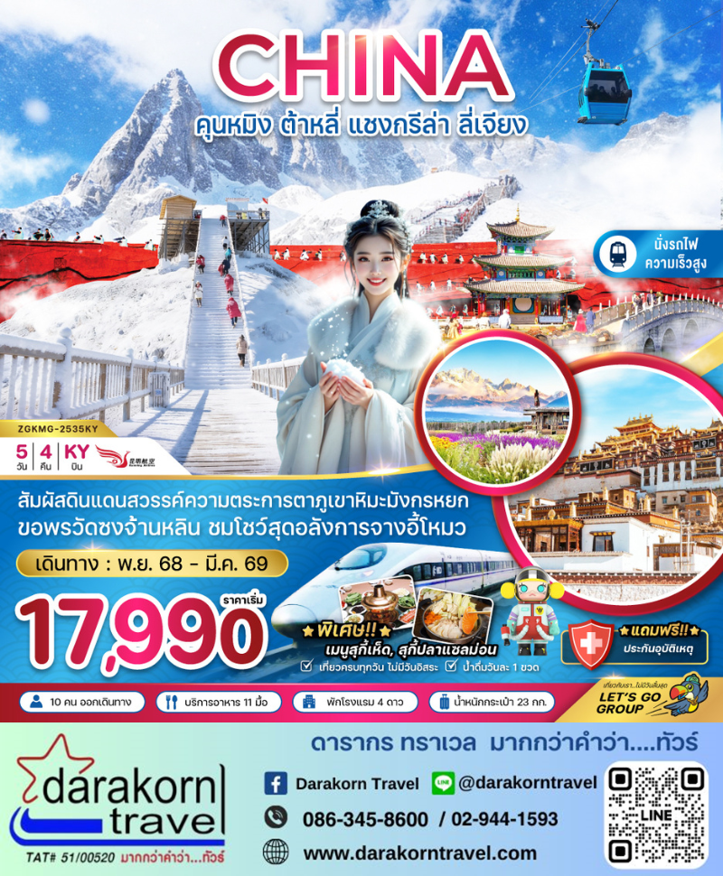 | DAY2 | นั่งรถไฟความเร็วสูงคุณหมิง-ต้าหลี่ – เมืองต้าหลี่ – วัดเจ้าแม่กวนอิม – เมืองเก่าต้าหลี่ – เจดีย์สามองค์แห่งวัดฉงเซิ่น – เมืองแชงกรี-ล่า – เมืองโบราณแชงกรี-ล่า |