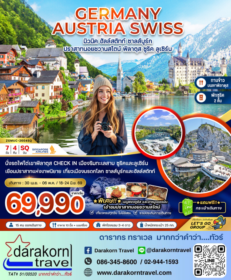 ทัวร์ยุโรป - เยอรมัน ออสเตรีย สวิตเซอร์แลนด์ (ปราสาทนอยชวานสไตน์ เขาพิลาตุส) 8วัน5คืน(SQ)เดือนมิถุนายน 2569