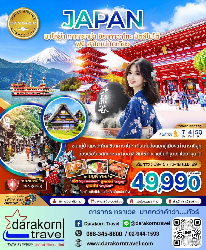 ทัวร์ญี่ปุ่น - นาโกย่า ทาคายาม่า ชิราคาวาโกะ มัตสึโมโต้ ฟูจิ ฮาโกเน่ โตเกียว 7วัน4คืน(SQ)เดือนเมษายน 2569