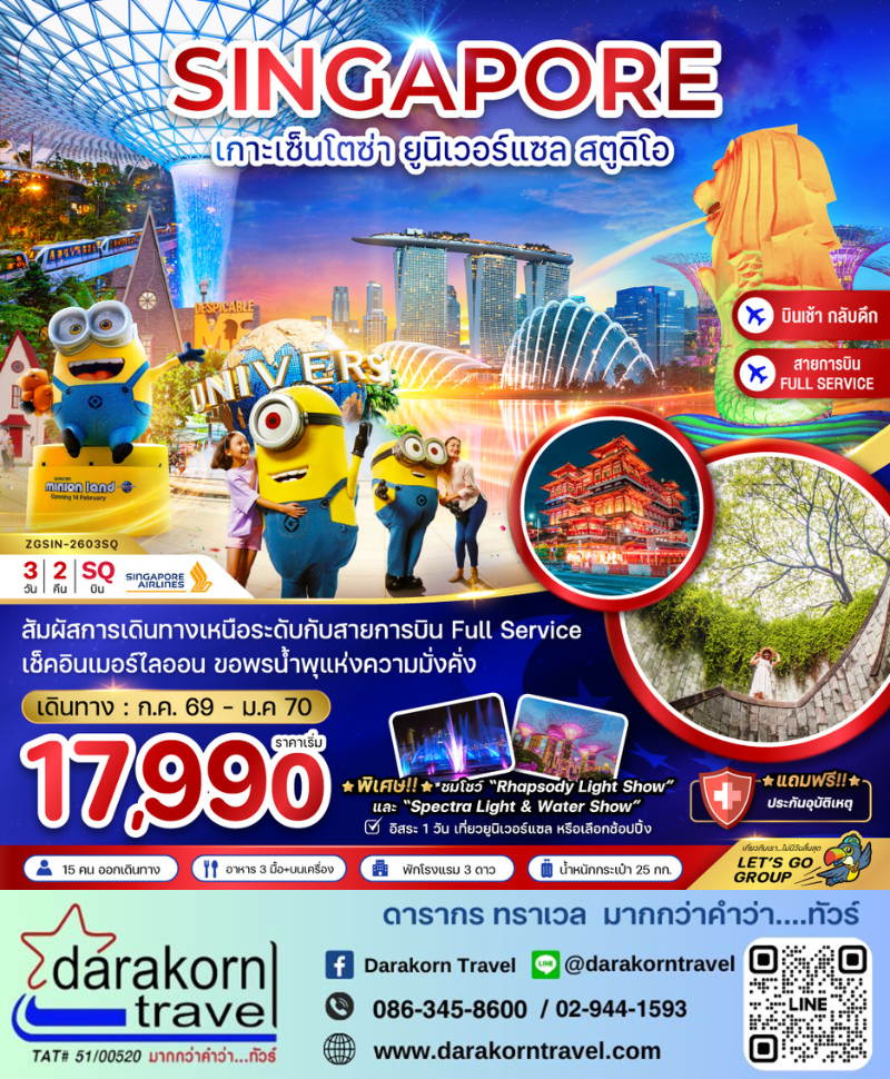 | DAY1 | สนามบินสุวรรณภูมิ – สนามบินชางงี – ประเทศสิงคโปร์ – น้ำพุแห่งความมั่งคั่ง –การ์เด้นส์ บาย เดอะ เบย์ – RHAPSODY LIGHT SHOW – มารีน่า เบย์ แซนด์ส – โชว์น้ำพุ SPECTRA LIGHT & WATER SHOW |
