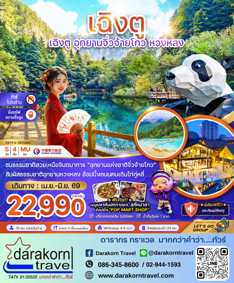 ทัวร์จีน - เฉิงตู อุทยานจิ่วจ้ายโกว หวงหลง (ไม่ลงร้าน-นั่งรถไฟความเร็วสูง) 5วัน4คืน(MU)เดือนเมษายน - มิถุนายน 2569